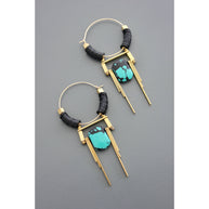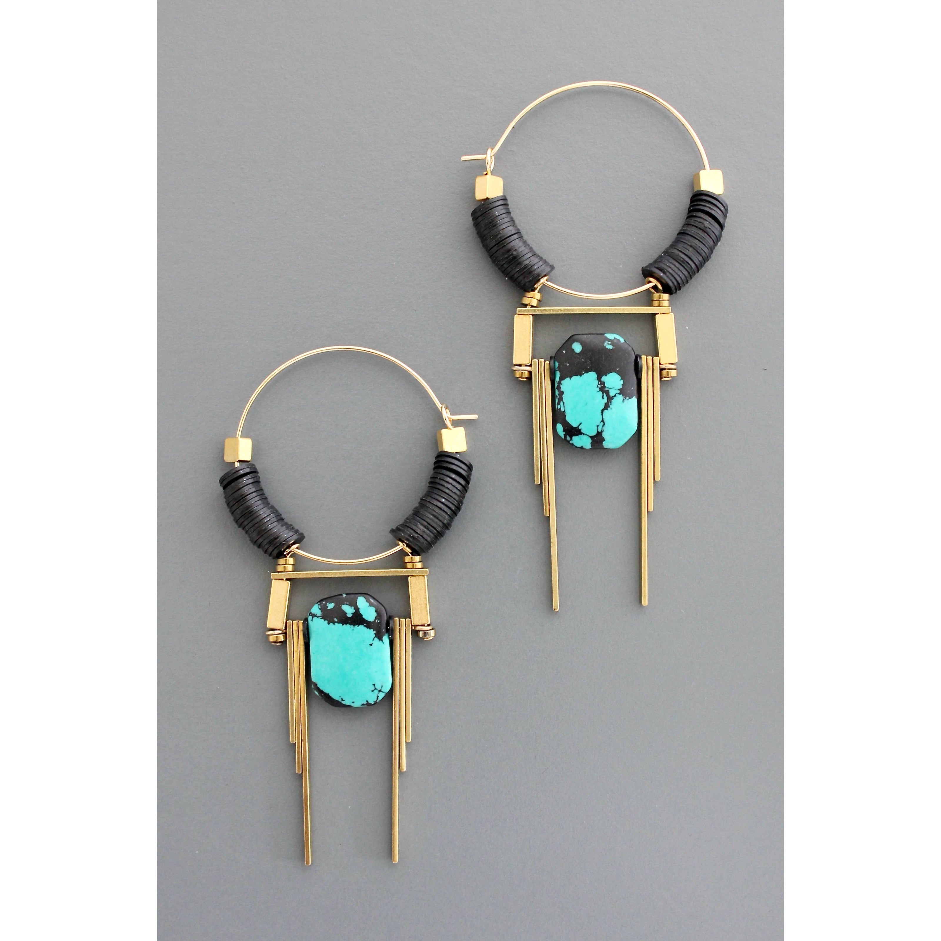 Gold plated brass hoops with synthetic turquoise and black vulcanite. Each earring weighs .29 oz. and measures 3.375 inches long. All pieces are made to order and handcrafted at our studio in New Jersey by skilled artisans who share our passion for quality and originality. Each piece is unique so stones and glass may vary in shape, size, and color. Stone inclusions may be visible to the eye and are considered a part of their beauty. Please allow 2-5 weeks for production. Our jewelry consists of plated metal, which may darken or tarnish over time with normal wear. Gently wipe the metal surface with a soft cloth to clean, however, excessive polishing may rub off or scratch the plating. Avoid direct contact with lotions, perfumes, or oils. Excessive light, heat, or moisture will deteriorate the quality of glass, plating, and stones. Do not wear jewelry while in a pool, hot tub, or bathing. If treated with care, your jewelry will last for years to come.