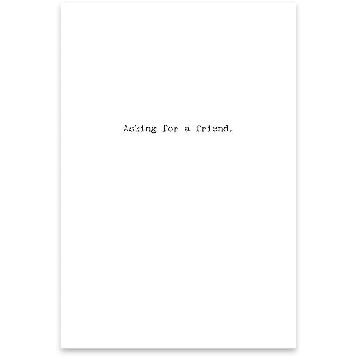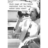 A humorous greeting card from our Trash Talk by Annie Collection features a vintage photograph with "What Page Of The Bible Explains How To Turn Water Into Wine…" sentiment on the outside, and "Asking For A Friend." sentiment on the inside. Our For A Friend greeting card is made in the USA.