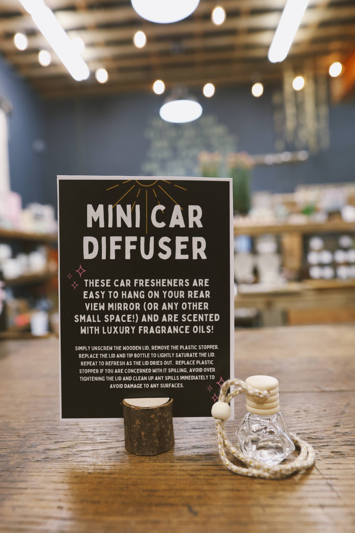 Garden Party Scented Oil Car Diffuser A sweet floral combination consisting of rose, lily of the valley, wild jasmine, and sweet lilac flowers. Top - Jasmine Middle - Lilac, Rose Bottom - Hawthorne 10ml glass bottle with a wooden lid. Approx 2.25" tall, with 7" of hanging rope. Bottle inside is cushioned with hand cut recycled yarn! Instructions are included on the label. Packaged perfectly for gifting or stocking stuffers! Packaged box is 2" x 2" x 2" I highly recommend you purchase a tiny sniffer tester bottle to display with each scent. The packaging does not allow for someone to open the box to sniff the scent. The tester is a small amber glass bottle, labeled with the scent name. * carcinogen free! * mutagen free! * paraben free! * phthalate free! * toxin free!