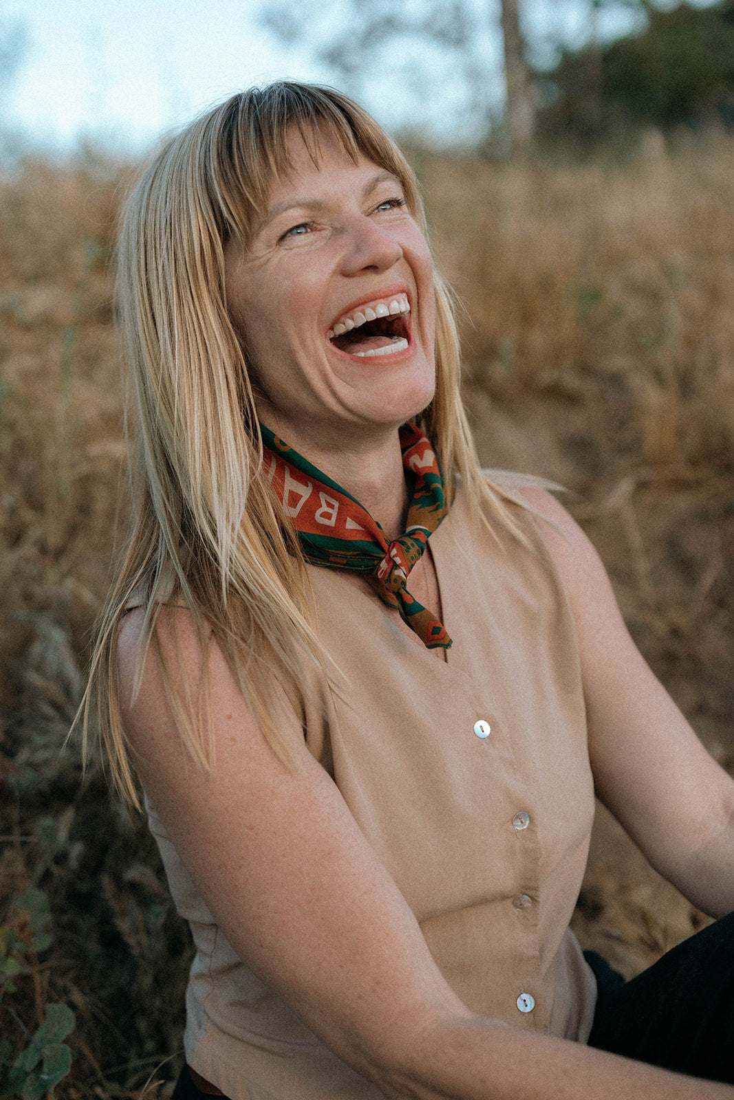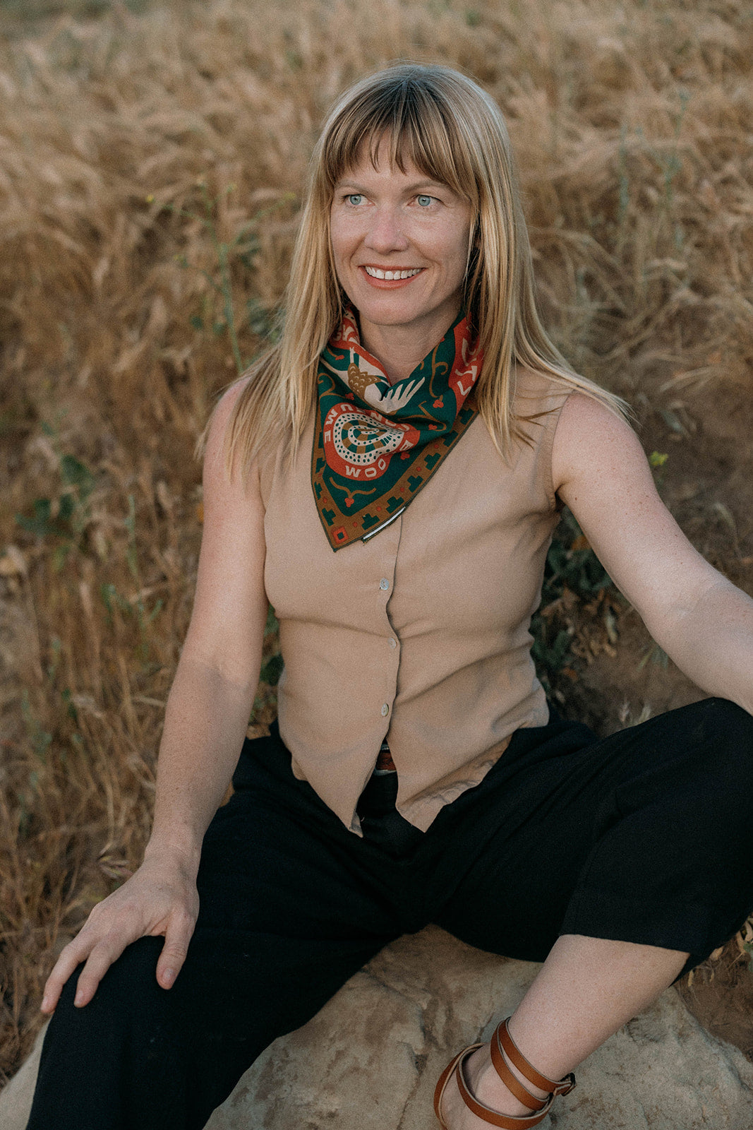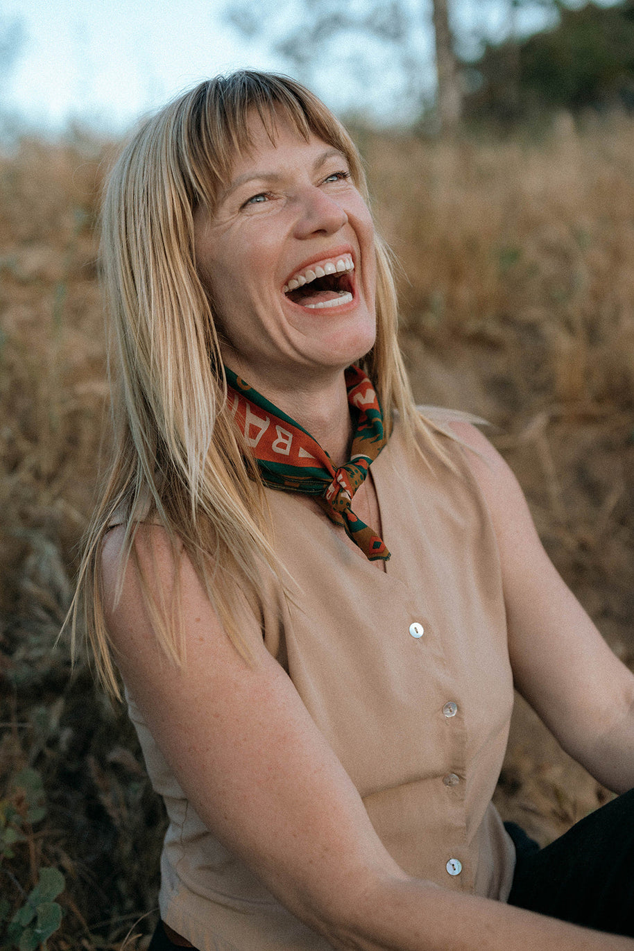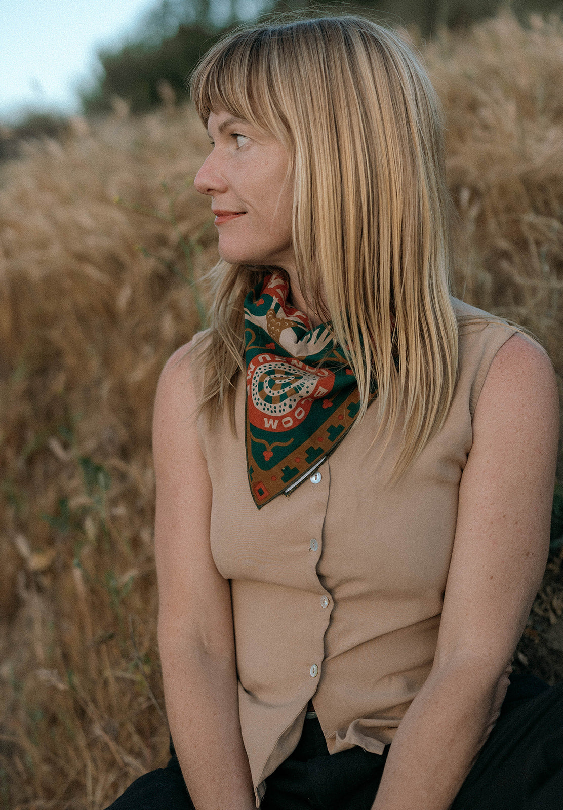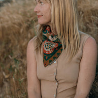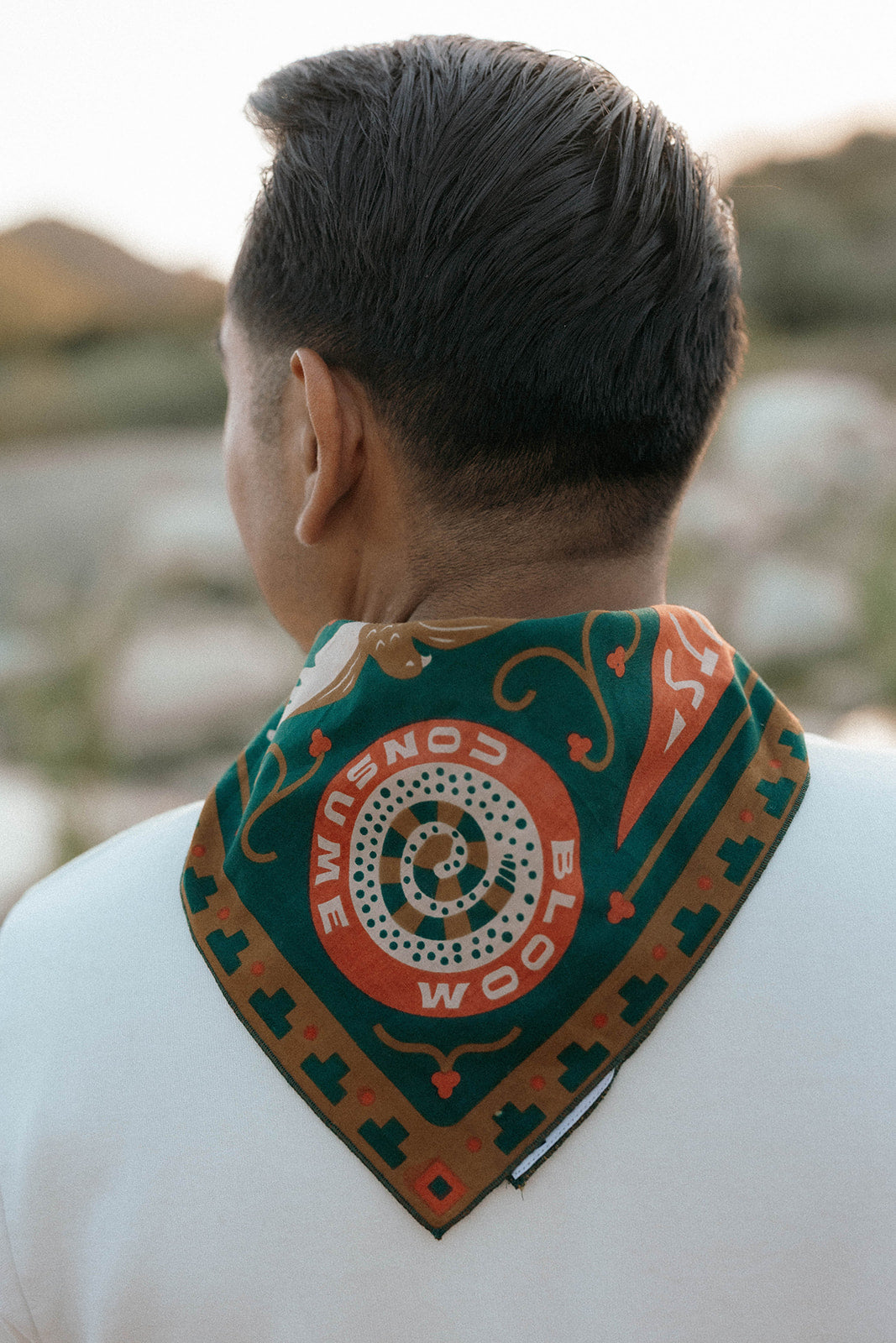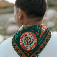 Sam's bandana is inspired by his experiences enjoying the local geography in his hometown of Austin, Texas. Specifically, Sam pays homage to kayaking the "Greenbelt" with friends. The "Greenbelt" refers to the local 12-mile system of hiking trails, waterways, limestone cliffs, and springs around Barton Creek in Austin, including the famous Barton Springs natural swimming pool.