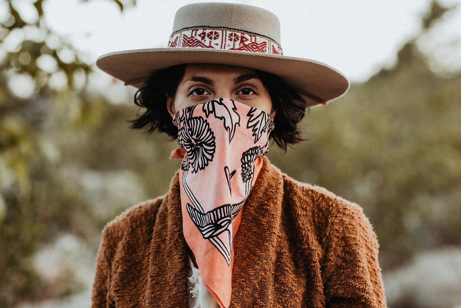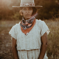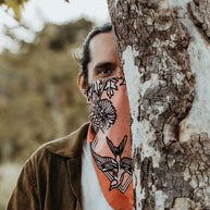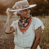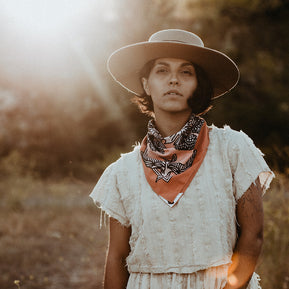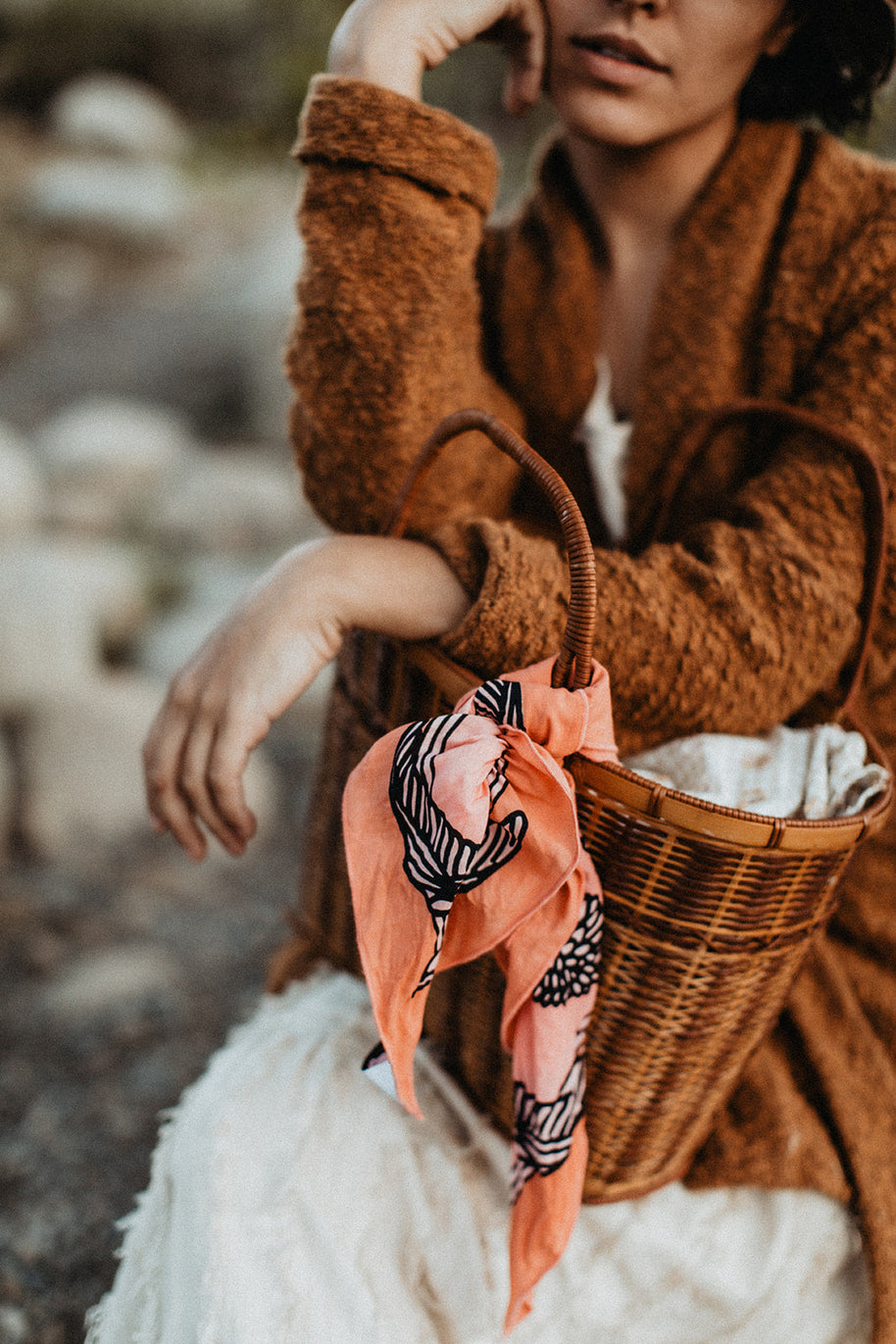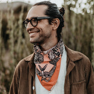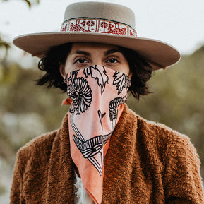 With colors reminiscent of the "Pink Moment," Daren's bandana design serves as an homage to the magical Ojai Valley, and wearable reminder of nature's most majestic, uplifting phenomena.