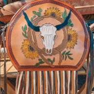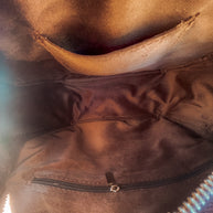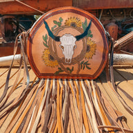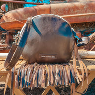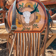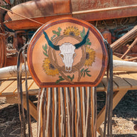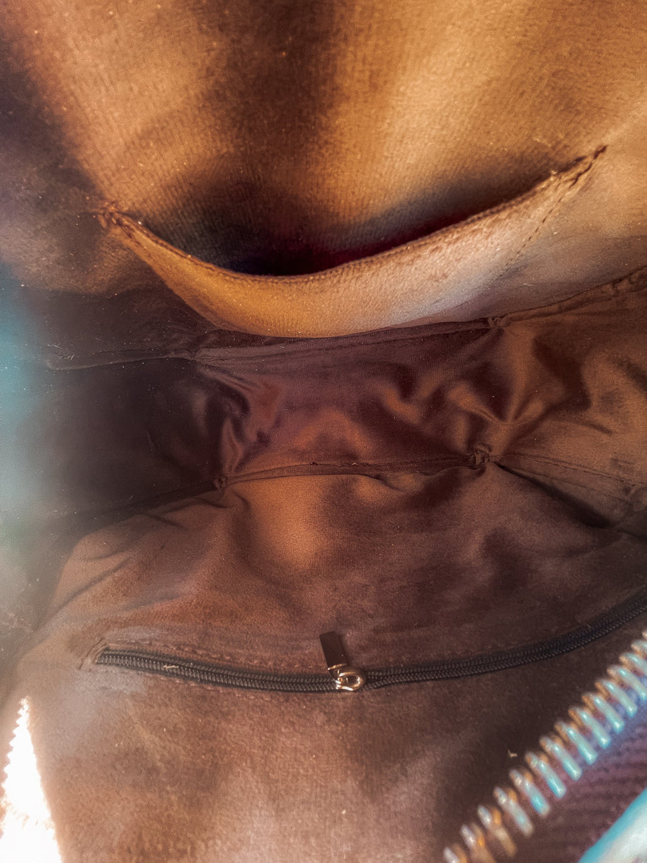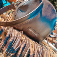 Introducing Life In The West, a Haute Southern Hyde by Beth Marie Exclusive. The canteen shape accentuated with multi-colored fringe has Wild West written all over it. Shes Western and a Strong Statement Indeed. Dive into Modern Day Western Luxury every time you open your bag and reach in to feel the beautiful Brown Velvet. Storage space includes one zippered pocket and one cubby pocket.