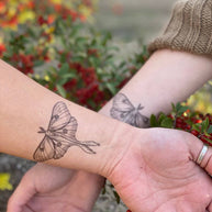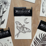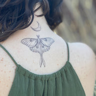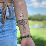 Luna Moth temporary tattoo. Luna moths are a pale green moth, with small eye-shaped patterns on each wing. Their wings each have an elongated double ribbon-like tail, which is one of their most recognizable features. This original hand-drawn design has a furry little body, a wide wingspan, and a crescent moon above. Lasts 2-5 days • Water-resistant • Comfortable • Skin Safe All original designs by Allison Wilcoxen in Austin, Texas.