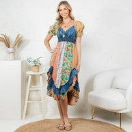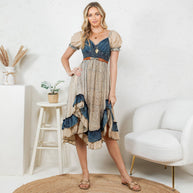 This mid-length dress features a sweetheart neckline and a fun denim patchwork design that mixes 60s boho vibes with Western charm. Made from denim, cotton checks, and rayon, it combines sturdy texture with softness and breathability. The asymmetrical skirt with playful denim ruffles adds extra flair and movement. Lightweight and comfy, it’s perfect for casual outings or semi-formal summer days, offering a flattering, relaxed fit. Easy to care for—just hand wash and enjoy your stylish new favorite dress!