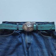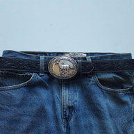 One of a kind Western Buckle in a silver plating finish Dimension of the buckle : 3.6" x 2.9" Width of belt is 1.5" or 38 mm, perfect width for jean Size S: Total length from Start of strap to middle hole 33", then add 5" more to tip end Size M: Total length from Start of strap to middle hole 36", then add 5" more to tip end Size L: Total length from Start of strap to middle hole 39", then add 5" more to tip end For example, size M, the total strap length is 41" Strap has snaps if need to remove buckle