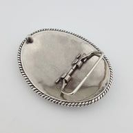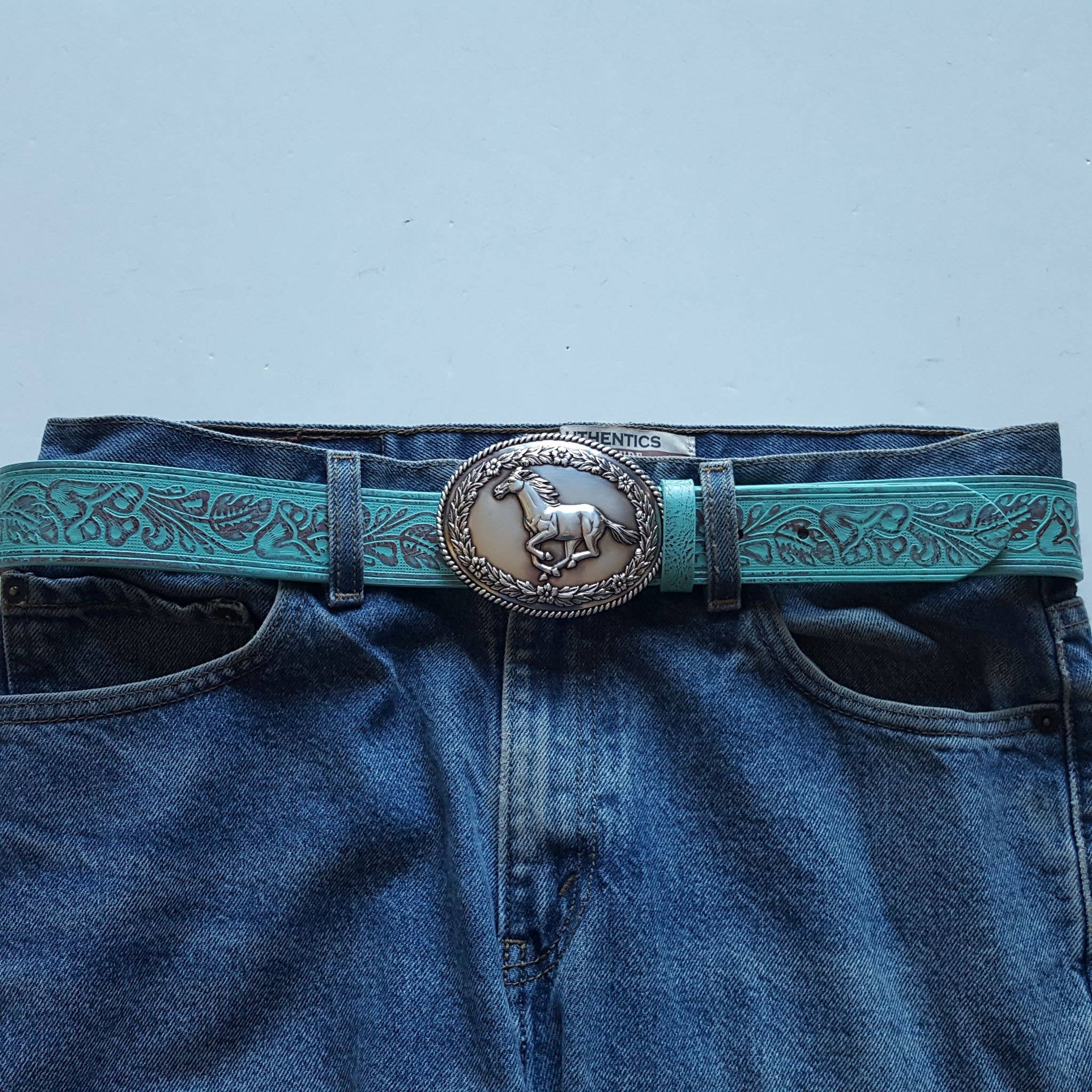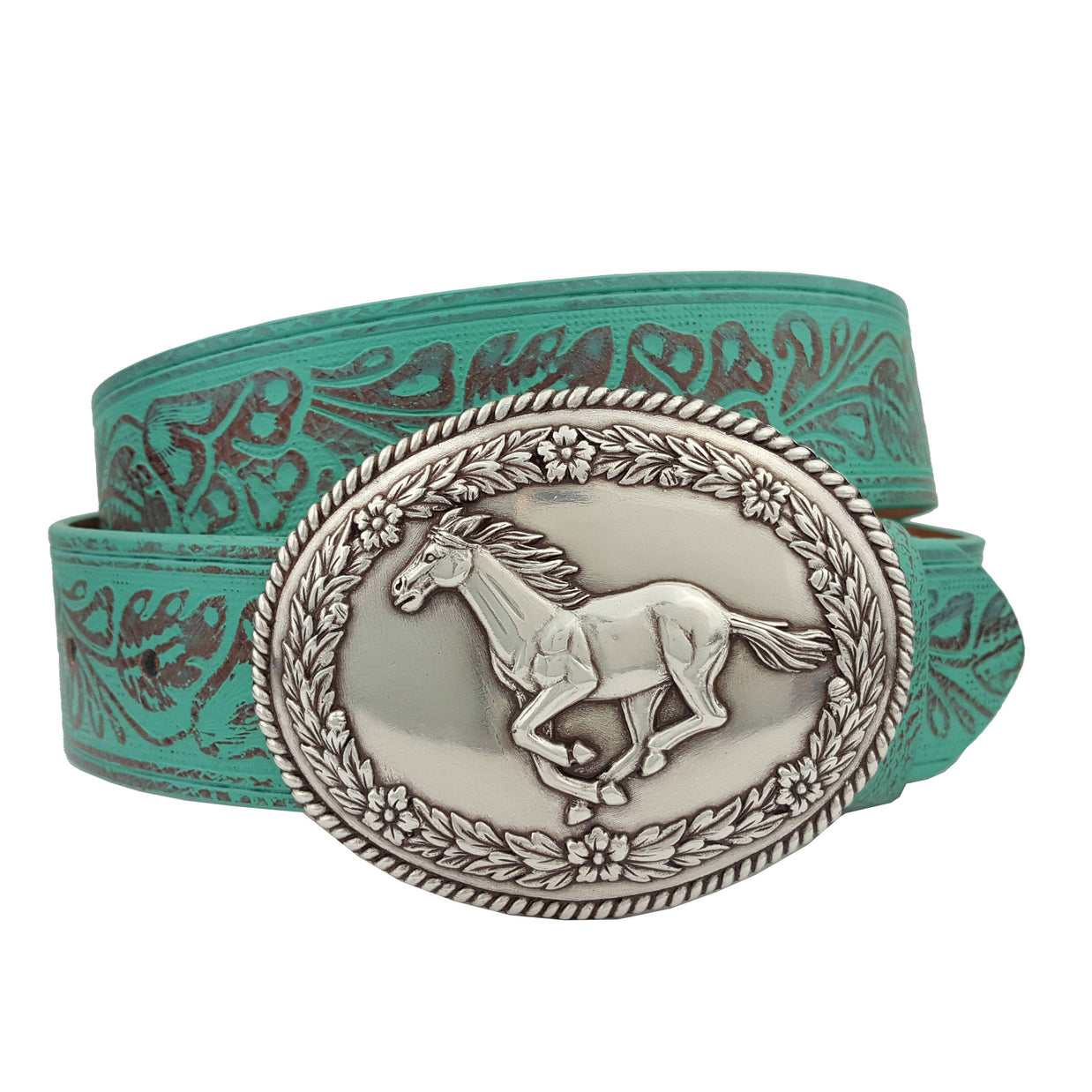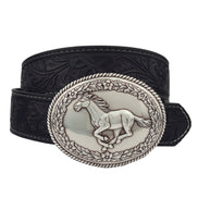 Silver Western Galloping Horse w. floral tooled belt