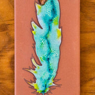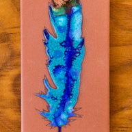 3”x6” Hand Painted Watercolor Feather. No two pieces are alike. Using a proprietary technique developed over the years, we are able to achieve a Watercolor like effect with these unique pieces. The background is left unglazed to let the matte Terra Cotta show through. All tiles come cork backed so they will not scratch your tables. A hole has been provided at the top of the backing for easy hanging. Each tile is hand glazed, no two are alike and glaze variations are to be expected.